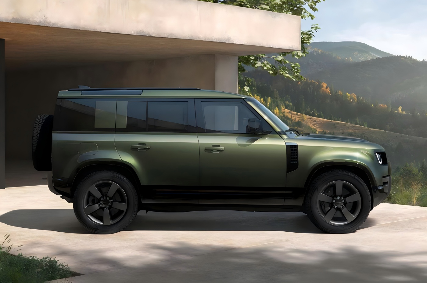 Sisih. Ndeleng saka sisih, kendaraan anyar terus gaya klasik ing tanah Rover Defender. 110 versi nganggo desain papat lawang, nampilake fendo ngarep lan sisih mburi, bebarengan karo rodha limang spok lan calipers rem multi-piston. Ukuran awak tetep ora owah, kanthi dawa, jembar, lan dhuwur 5018/2105/1966/1967 mm, lan rodha 3022 mm.